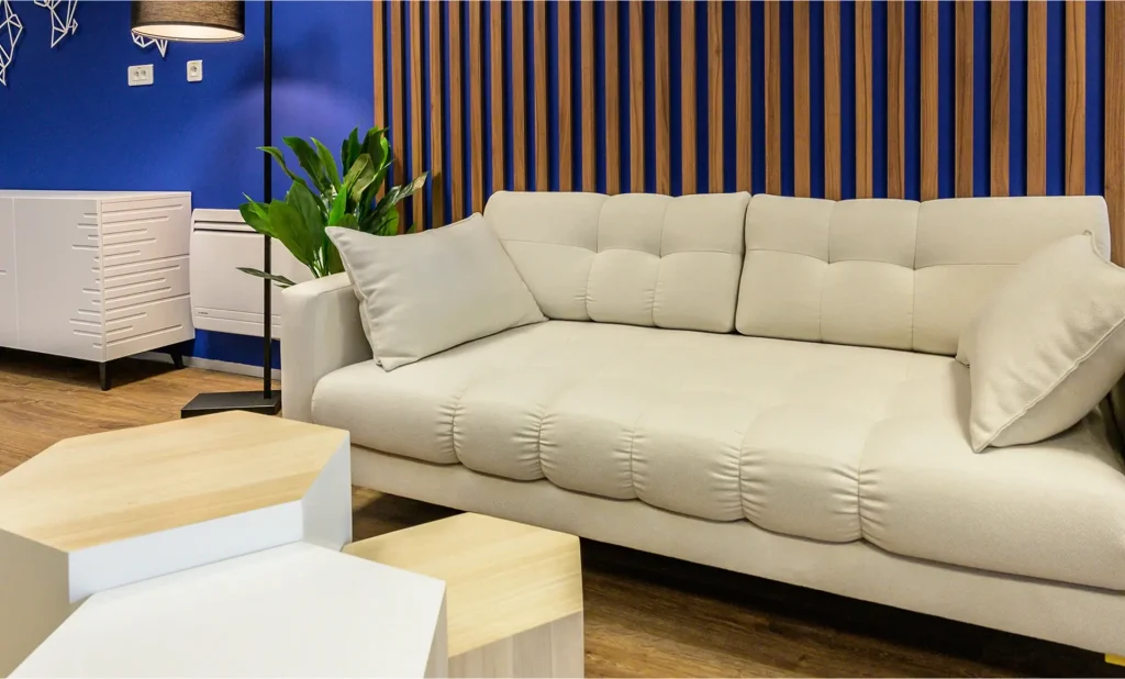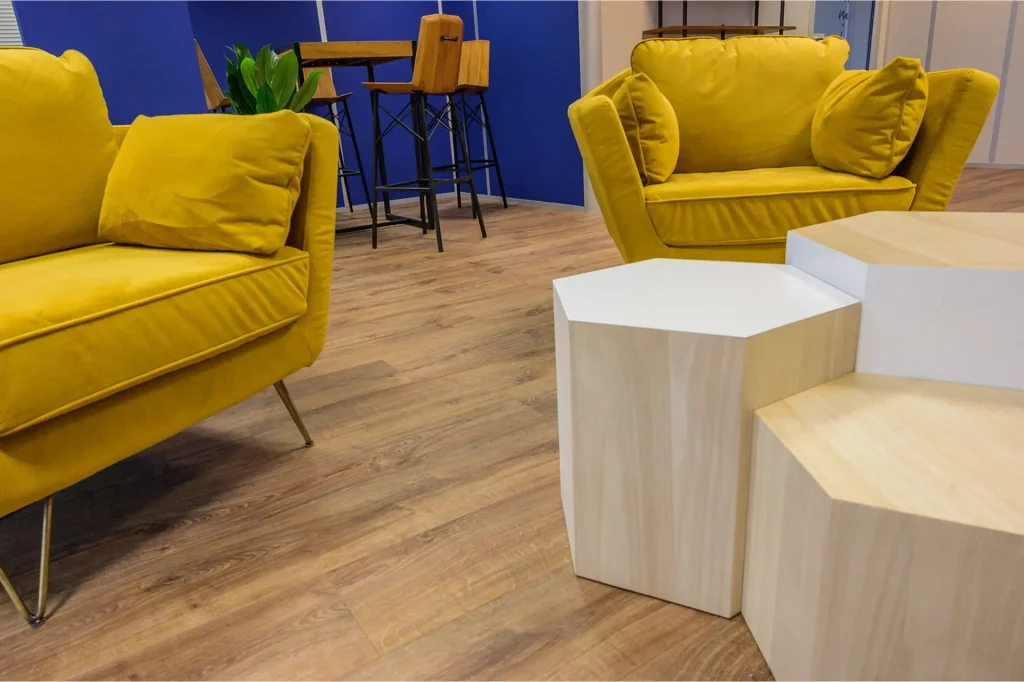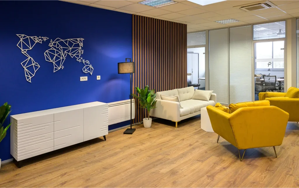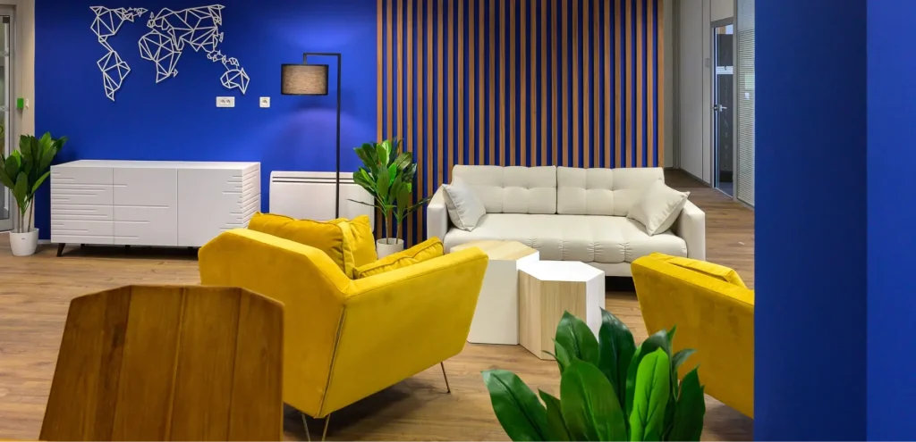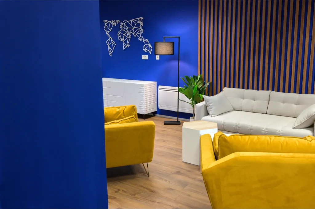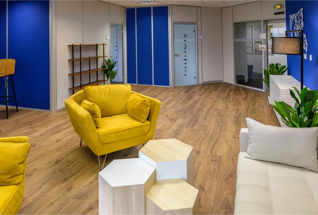 L’idée de cet aménagement est de créer un espace reposant et convivial, en apportant des touches de couleurs franches et pétillantes, tout en conservant un ensemble chaleureux. Le bleu, reposant, prédomine et s’invite sur les murs afin d’apporter une sérénité et une ambiance reposante au lieu. Les fauteuils jaunes accueillants et plus toniques apportent leur présence en contraste, et réveillent l’espace. Les plantes vertes viennent compléter ce tableau en apportant leur fraicheur à l’ensemble, créant un séjour d’entreprise dépaysant.
