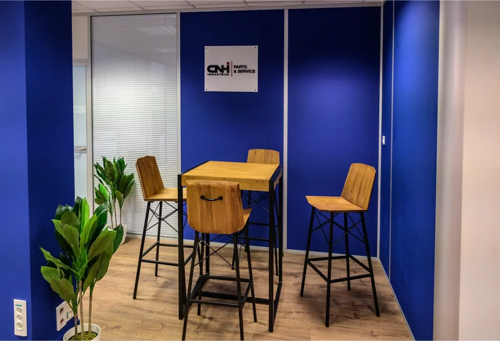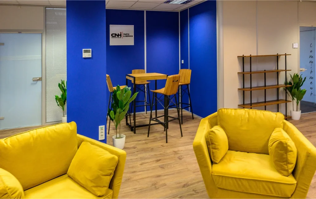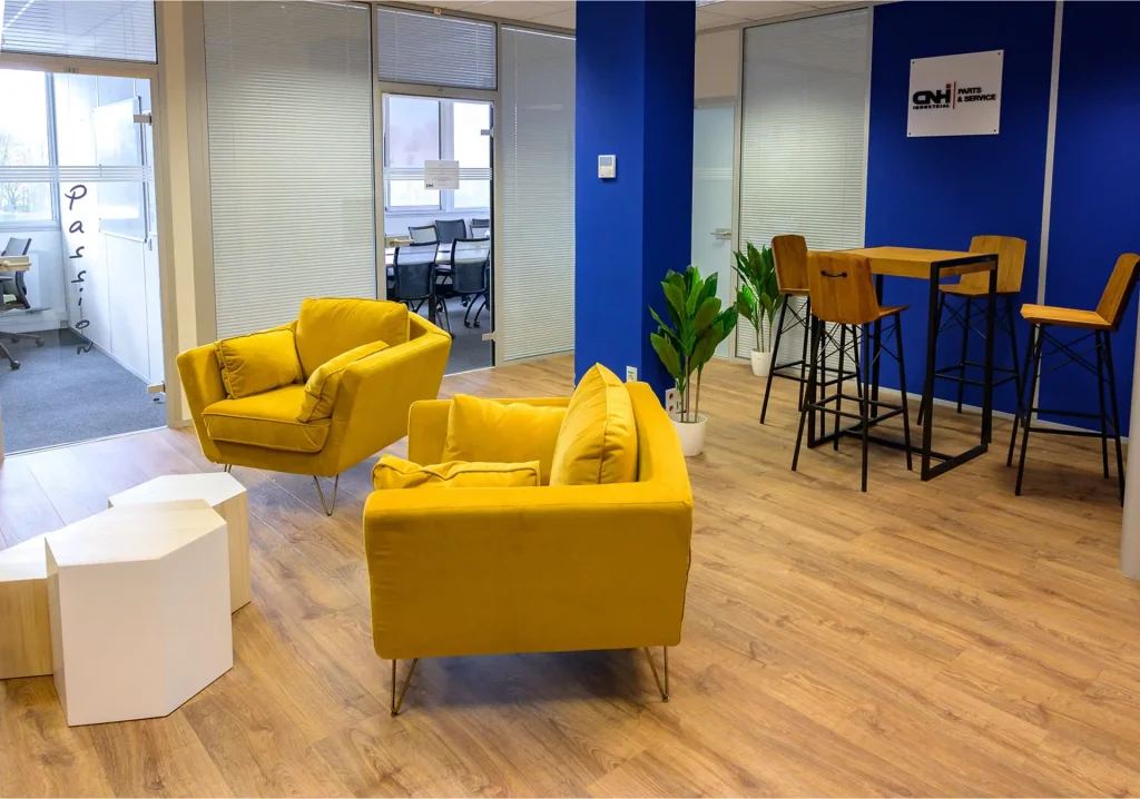 Imaginer un salon agréable et cosy pour les bureaux de l’entreprise CNH Industrial France. L’espace tertiaire impersonnel et pragmatique de style « boîte » existant doit être transformé en un salon de réception chaleureux pour la réception des clients de l’entreprise, mais également pour les cadres y travaillant quotidiennement.