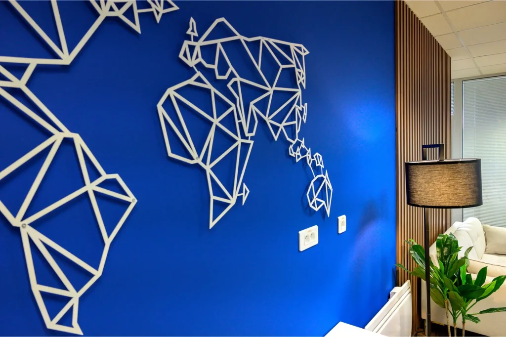L’originalité est de mise, avec des formes inattendues, ainsi la carte du monde en acier fait écho aux lignes géométriques de la table basse et des tabourets de bar. Elle est en acier et rappelle la dimension internationale de l’entreprise, ainsi que son activité, la production de pièces métalliques industrielles.