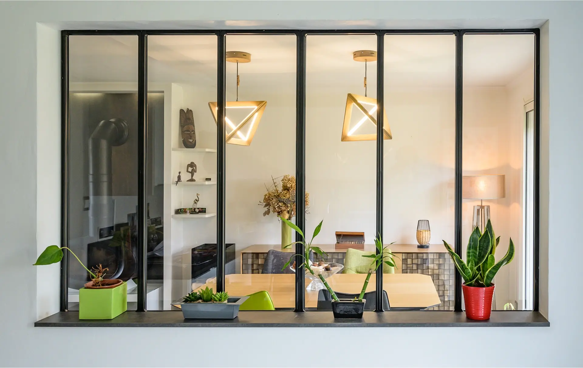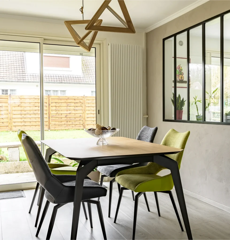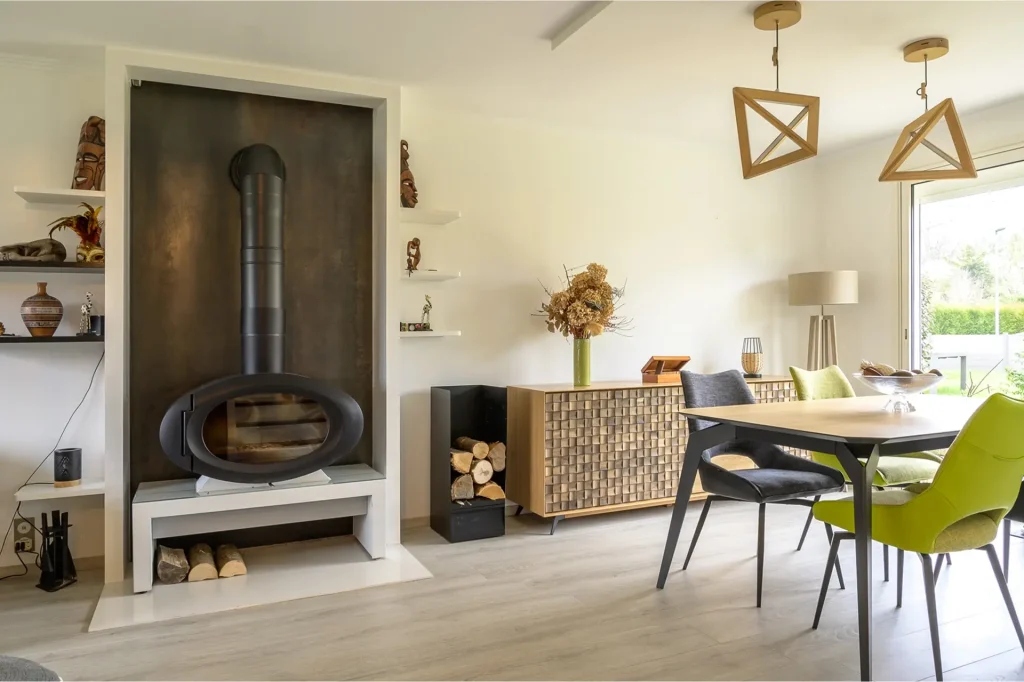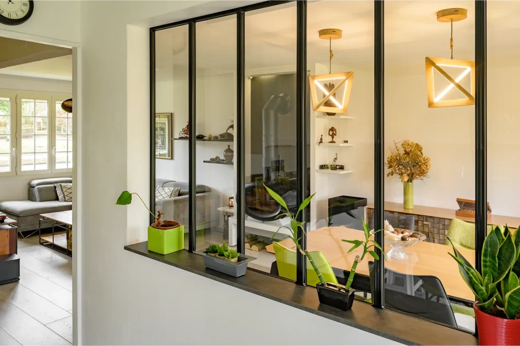 Ce volume du poêle structure ainsi l’espace, tout en symbolisant une transition entre salon et salle à manger. Une verrière a été placée entre la cuisine et la salle à manger afin d’ouvrir l’espace et d’apporter de la luminosité ainsi qu’une touche contemporaine.