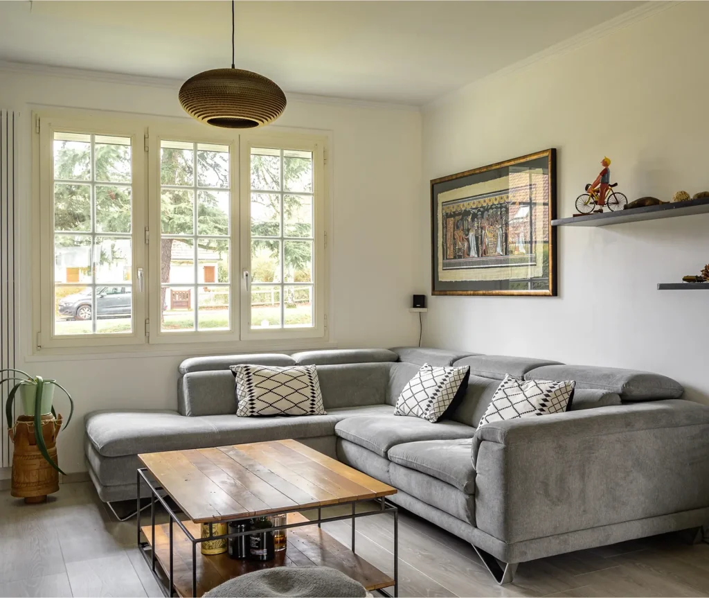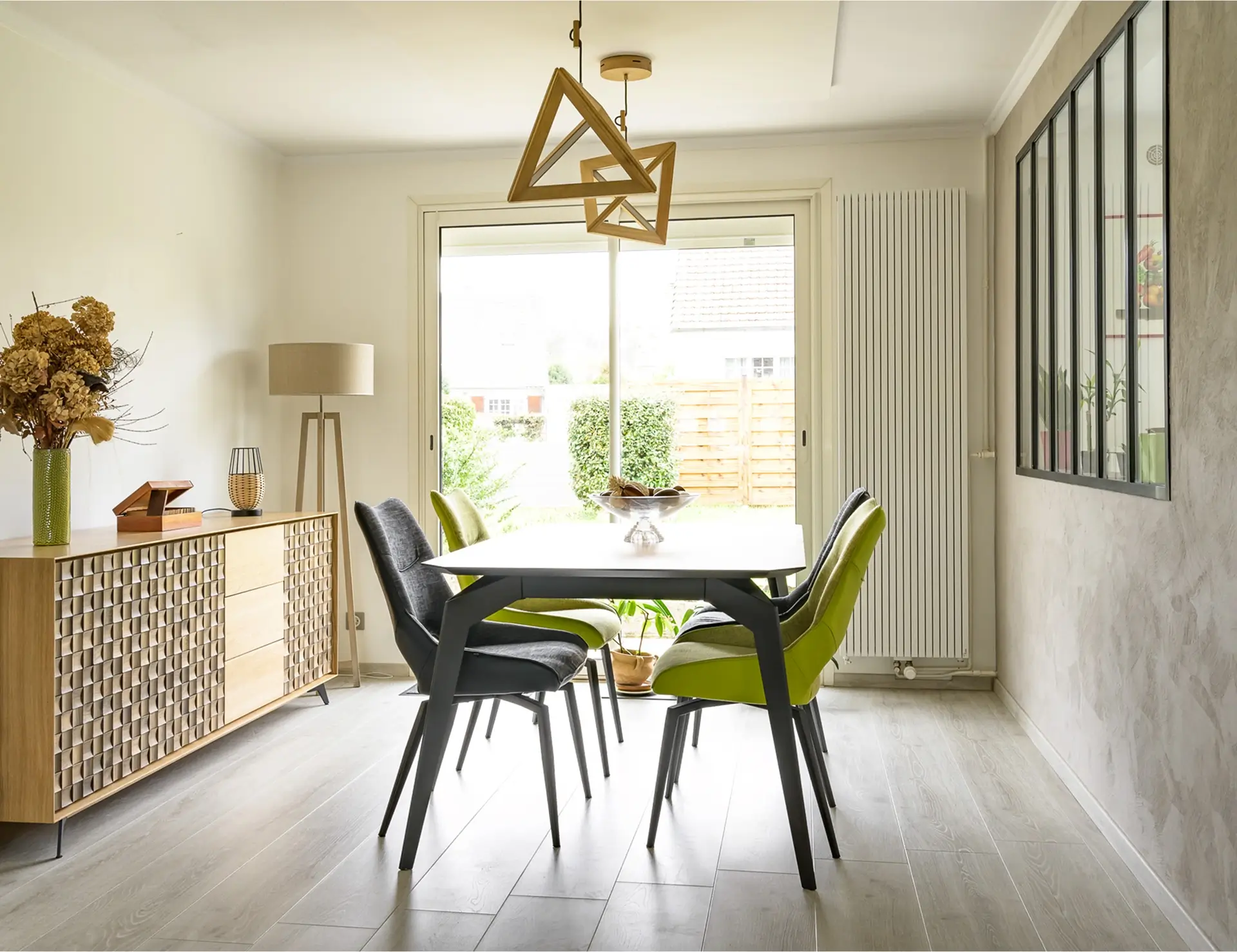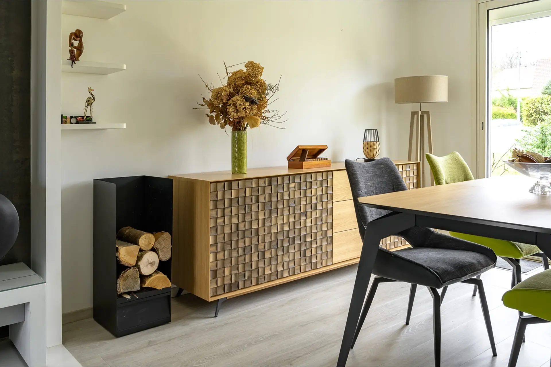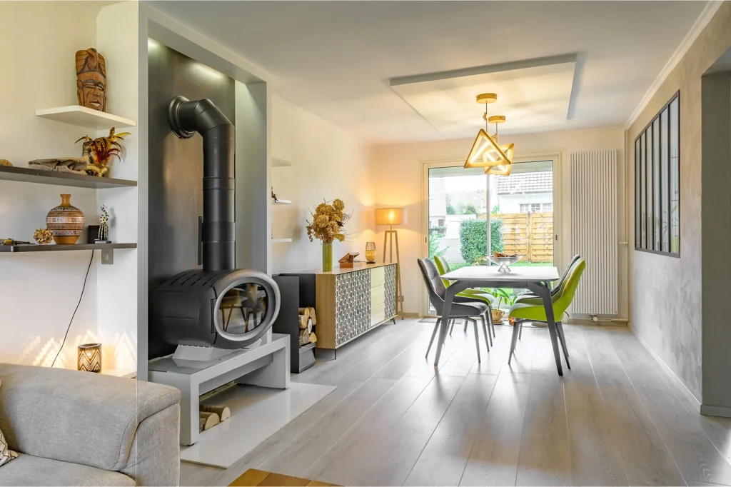 Aménagement et réagencement d’un espace salon et salle à manger, avec placement d’un poêle, et ouverture de la salle à manger sur la cuisine avec placement d’une verrière. L’objectif est de penser un espace en enfilade afin qu’il ne paraisse pas surchargé et que la circulation reste fluide et confortable.