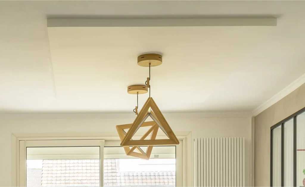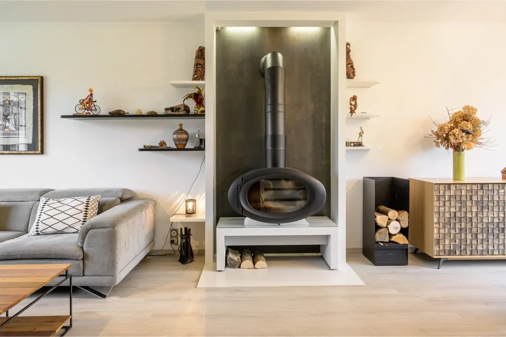 L’agencement global a été étudié afin d’une part de préserver un confort de circulation, et d’autre part d’alléger visuellement l’espace. La pose d’un poêle à bois central, et l’intégration de celui-ci avec un cadre permet de mettre en valeur et délimiter le carrelage effet acier rouillé posé derrière,. Ce cadre étant également utilisé pour disposer quelques tablettes décoratives de part et d’autre, avec l’usage d’accueillir et mettre en valeur les objets et souvenirs exotiques.