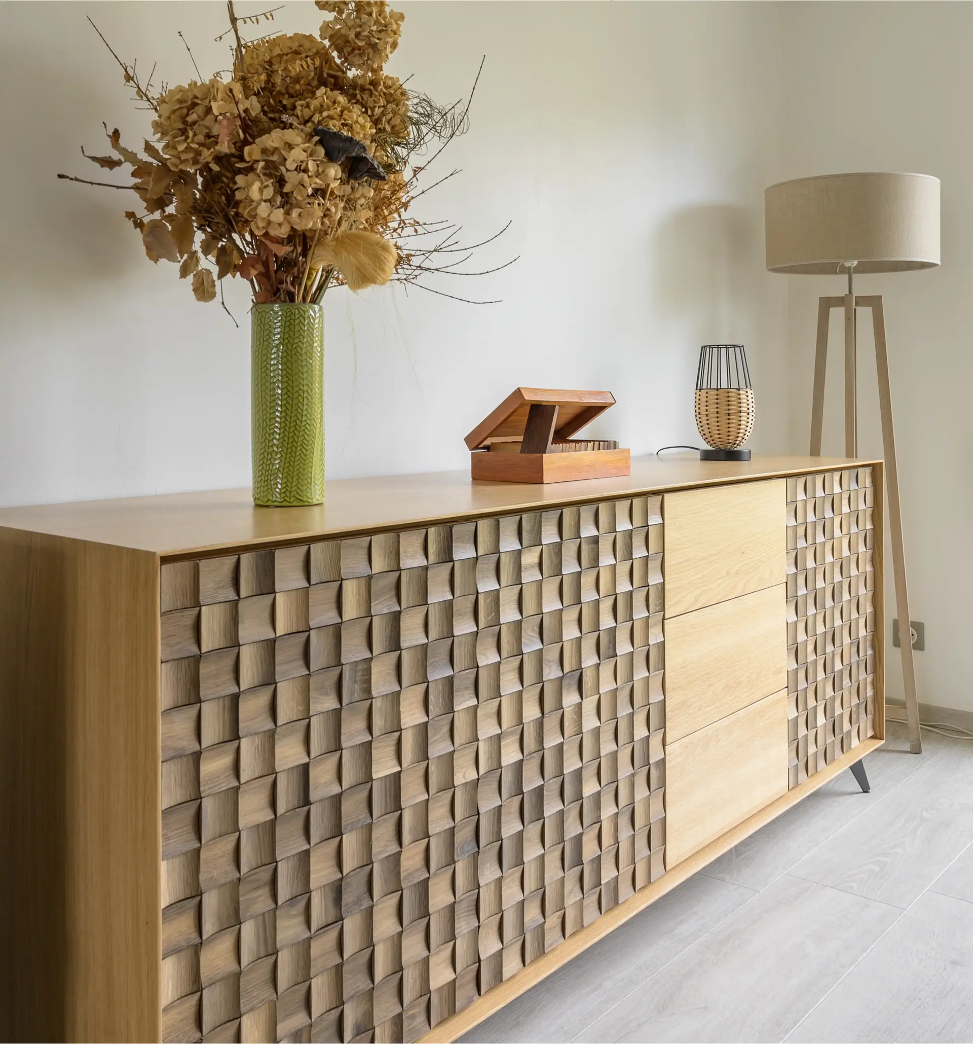 Les nombreux objets exotiques, souvenirs de voyage et séjours prolongés à l’étranger, seront à marier avec un mobilier aux lignes plus contemporaines. Le poêle est à placer de manière appropriée, ayant son indépendance, tout en faisant le lien et la transition entre le salon et la salle à manger.