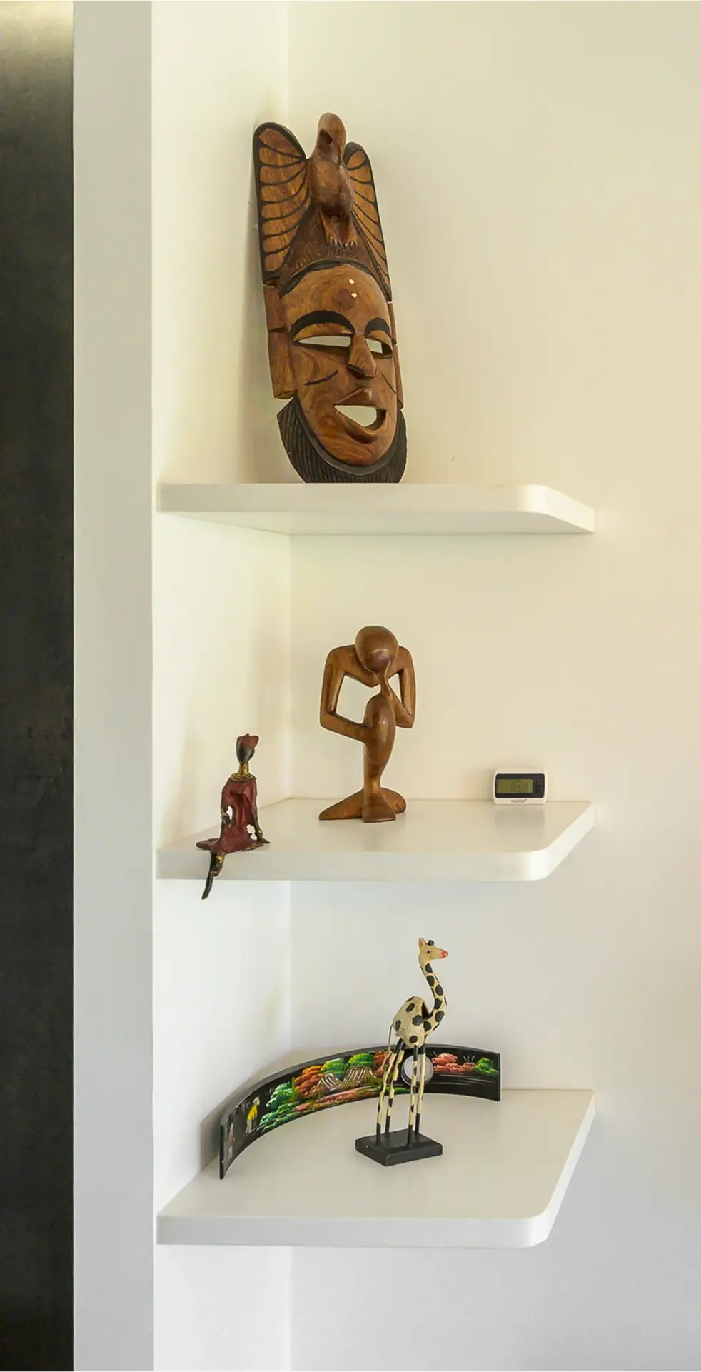 L’intérieur est un mix de deux styles en opposition : exotique / ethnique (objets souvenirs rapportés de nombreux voyages) et style contemporain, avec un choix de nouveau mobilier à l’allure et aux lignes bien plus contemporaine et marquées, pour une ambiance neutre et boisée, mais expressive et légèrement colorée. Les murs sont laissés blancs afin de conserver la luminosité.