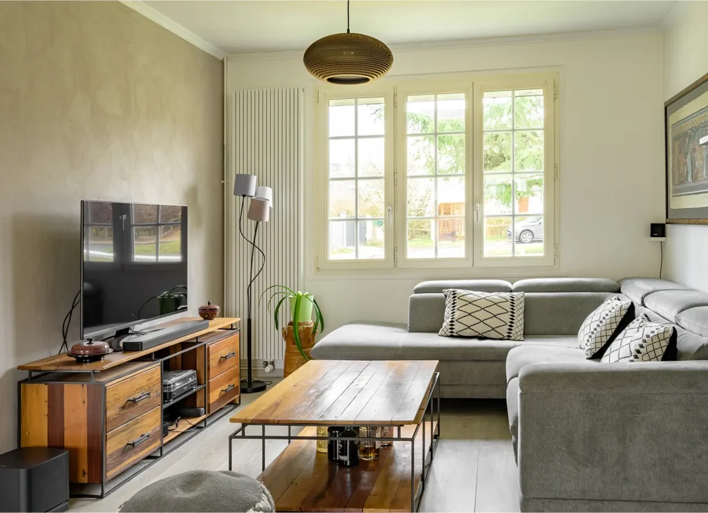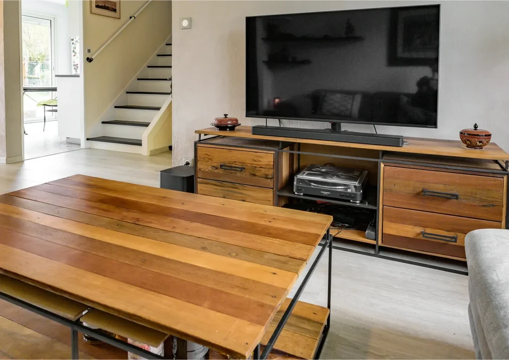 Le design de l’espace salle à manger a été fait dans un esprit contemporain avec quelques touches de couleur, et le placement du mobilier, aux lignes géométriques mais agréables, permet une circulation fluide. Le salon accueille un grand canapé confortable, il est associé à des matériaux de caractère, notamment du bois marin de récupération pour la table basse et le meuble TV. Le mobilier et les luminaires ont été choisis selon les détails de leur dessin pour s’accorder avec la décoration plus exotique.