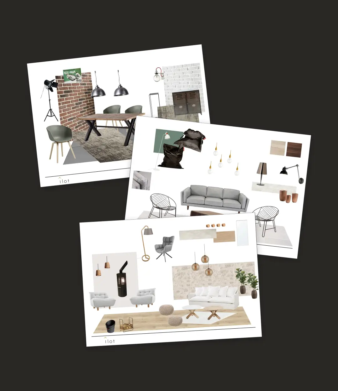 - Planches d’ambiance finalisées des matériaux, couleurs, mobilier et luminaires